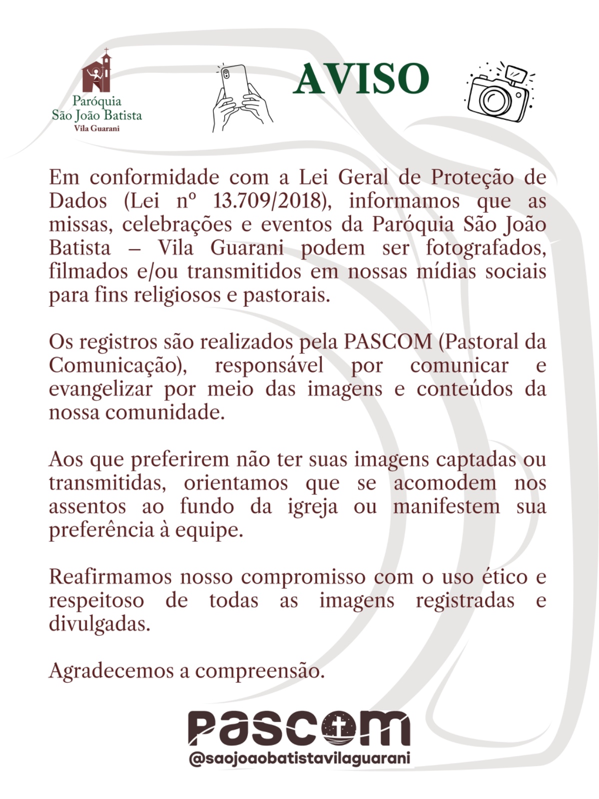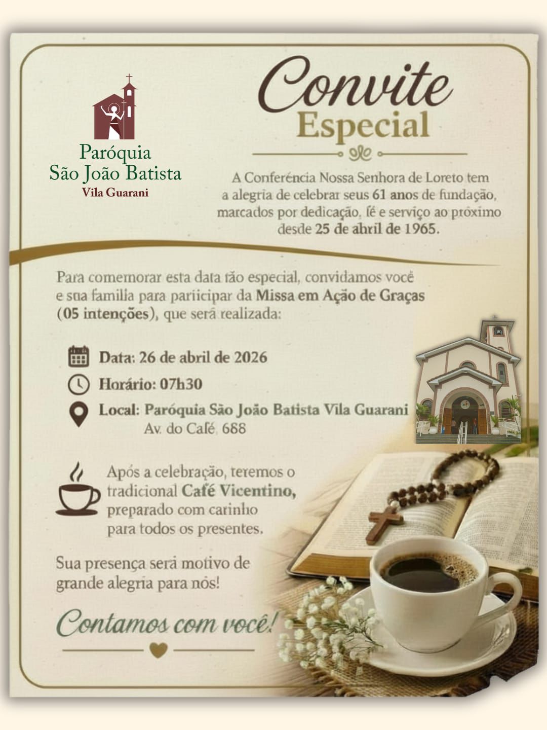 Comunidade que cresce na fé, na esperança e no amor. Conscientes do desafio da evangelização no mundo urbano, assumimos ser uma “Igreja em saída”, voltada para todos, tendo Jesus Cristo como centro da vida pessoal e fraterna.